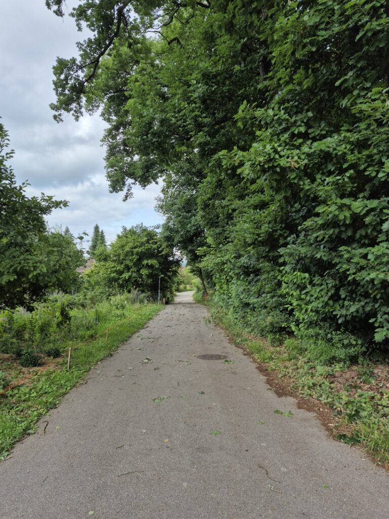 Seither sind kaum noch gröbere Äste auf die Strasse gefallen. Die Bewährungsprobe kam am 15. Juni 2025 in Form eines Gewittersturmes, der in der ganzen Region insbesondere alte Eichen und Buchen schwer beschädigte. Entlang unserer „Sorgenkind-Strasse“ fielen zum Glück nur Blätter und ganz feine Äste hinunter, siehe Foto.